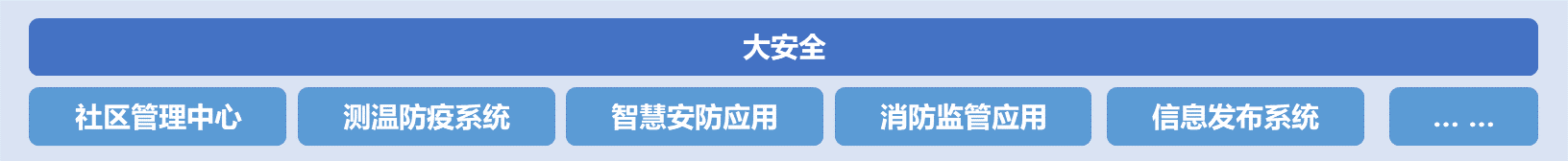 社区是社会的细胞,社区安全是社会稳定、和谐的基础,安全社区是全面建设小康社会、构建和谐社会和平安社会的重要组成部分,是落实以人为本,全面、协调、可持续发展的重要措施之一。大安全以物联网技术为支撑,从社区的安防、消防、监控、防疫为着手点,基于物联设备智能感知、视频智能识别、红外测温异常告警等智能手段,开发建设服务于社区安全监管的应用系统,保障社区安全稳定。