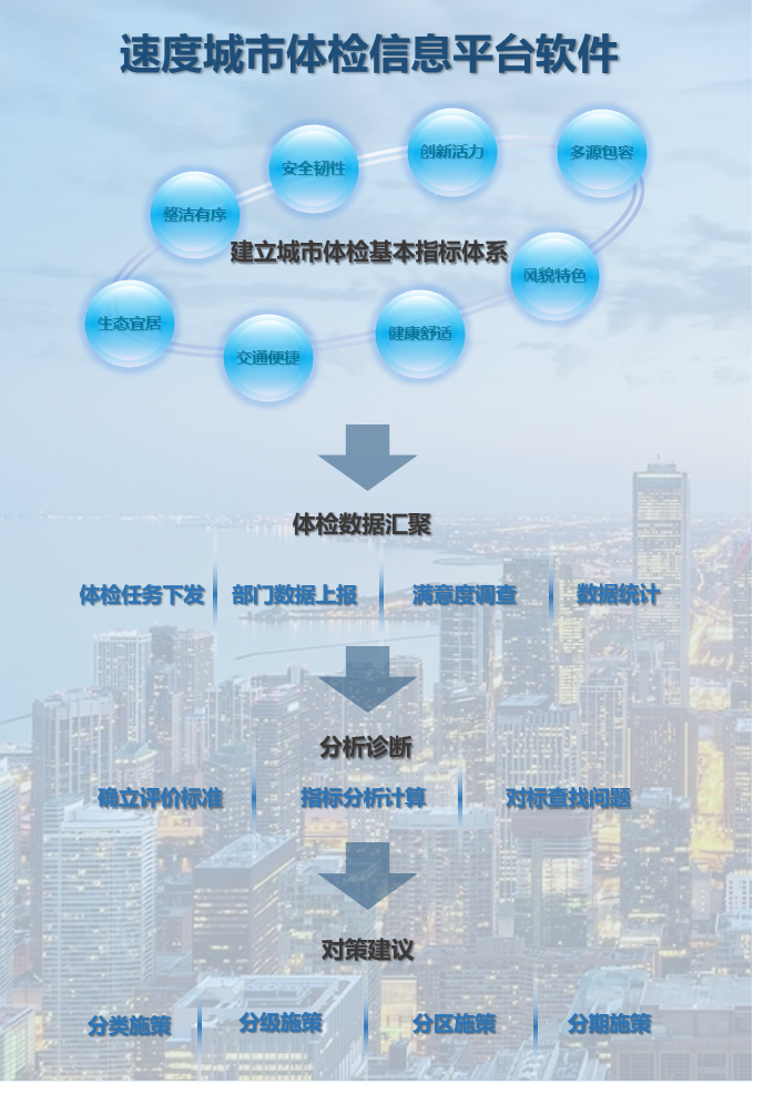 结合中共中央城市工作会议精神,落实住建部开展城市体检工作相关意见,建立统一收集、统一管理、统一报送的“速度城市体检信息平台”,是城市人居环境系统评价、发现“城市病”、开展治理行动、提升城市居民满意度和幸福感的重要手段,在城市建设、更新、健康发展过程中发挥着引领推动作用,同时借助智能化创新模式,贯彻“体检-诊断-治疗”总体思路,推动城市高质量发展、提高城市综合竞争力。