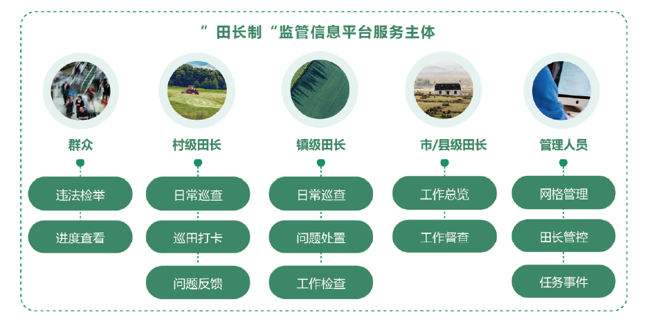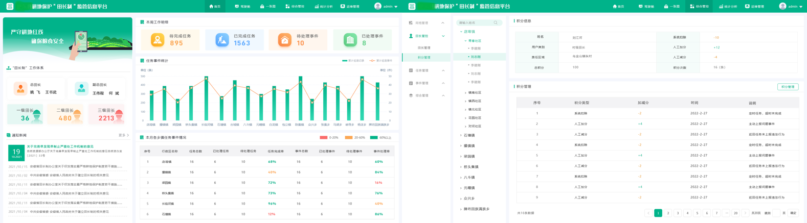 管控人员通过田长综合管控系统协助各级田长进行巡田任务制定、网格管理、巡田记录审核、运维管理等操作。本模块提供首页、一张图、综合管控、统计分析、运维管理、用户中心等服务。