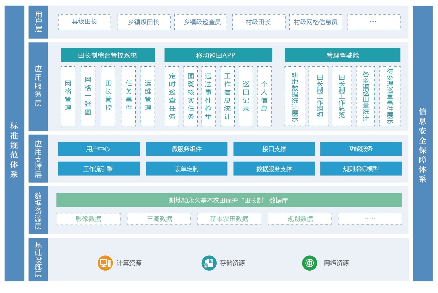 耕地保护“田长制”监管信息平台整体由5层构成,包括:基础设施层、数据资源层、应用支撑层、应用服务层、用户层。平台架构图如下所示: