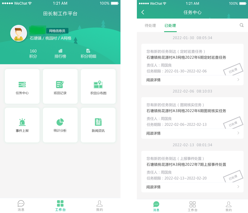 构建移动巡田APP应用,巡田员通过定期巡查、核实图斑、上报并处理事件完成耕地“非农化”日常监管。本模块主要功能为:定时巡查任务、图斑核实任务、上报事件处理、巡田记录、农田分布图、违法事件上报、工作信息统计、积分排行榜、新闻通告、个人中心等功能服务。
