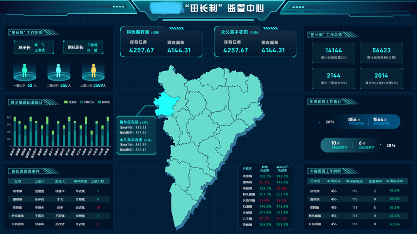 构建田长制管理工作驾驶舱,将各乡镇的耕地数据、巡田业务数据统计分析并进行展示,使领导时刻掌握各乡镇耕地非农化情况。本模块提供耕地数据统计展示、田长制工作组织、田长制工作总览、本周巡查工作统计、本周巡查工作明细、各乡镇巡田量统计、待处理巡查事件展示。