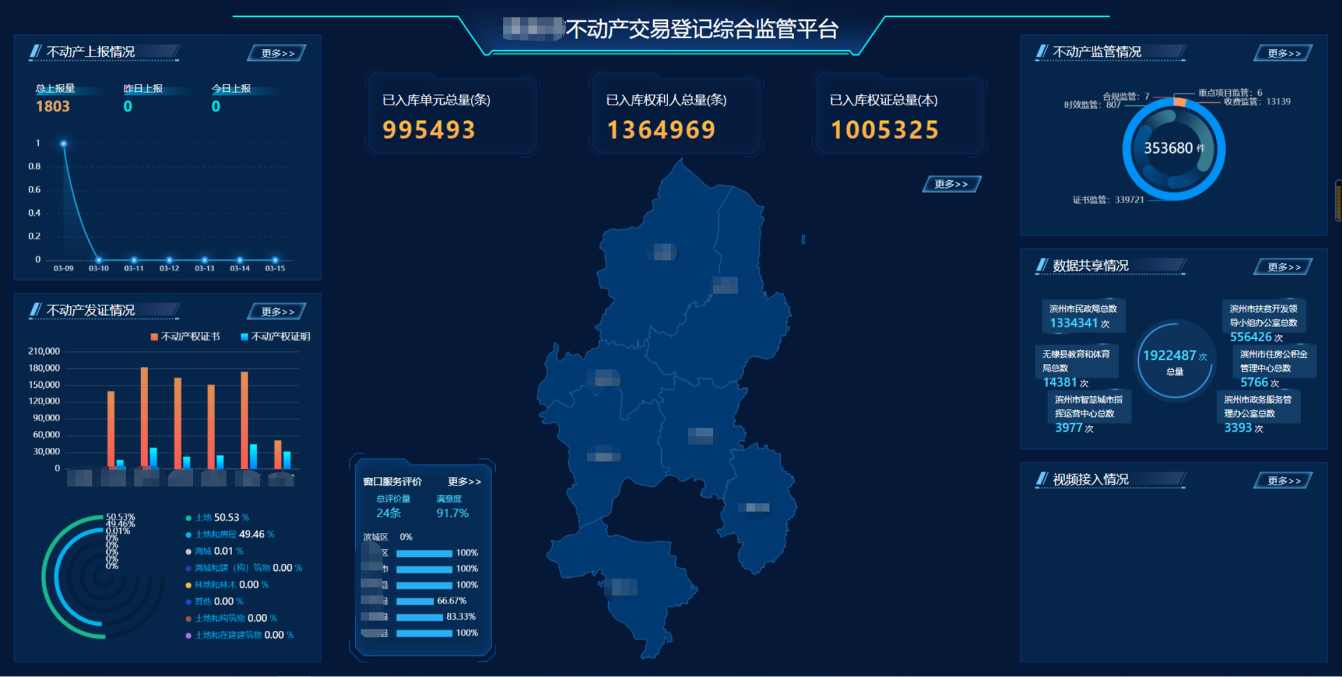 Ø 不动产登记数据大屏综合展示系统 基于不动产登记数据库,实时采集、汇总、分析,提取最重要的指标,以统计图表、动态地图、视频图像等形式在大屏上对关键登记数据信息和监管内容进行综合展示,客观反映不动产登记的数据总量、变化趋势、异常情况等。 |