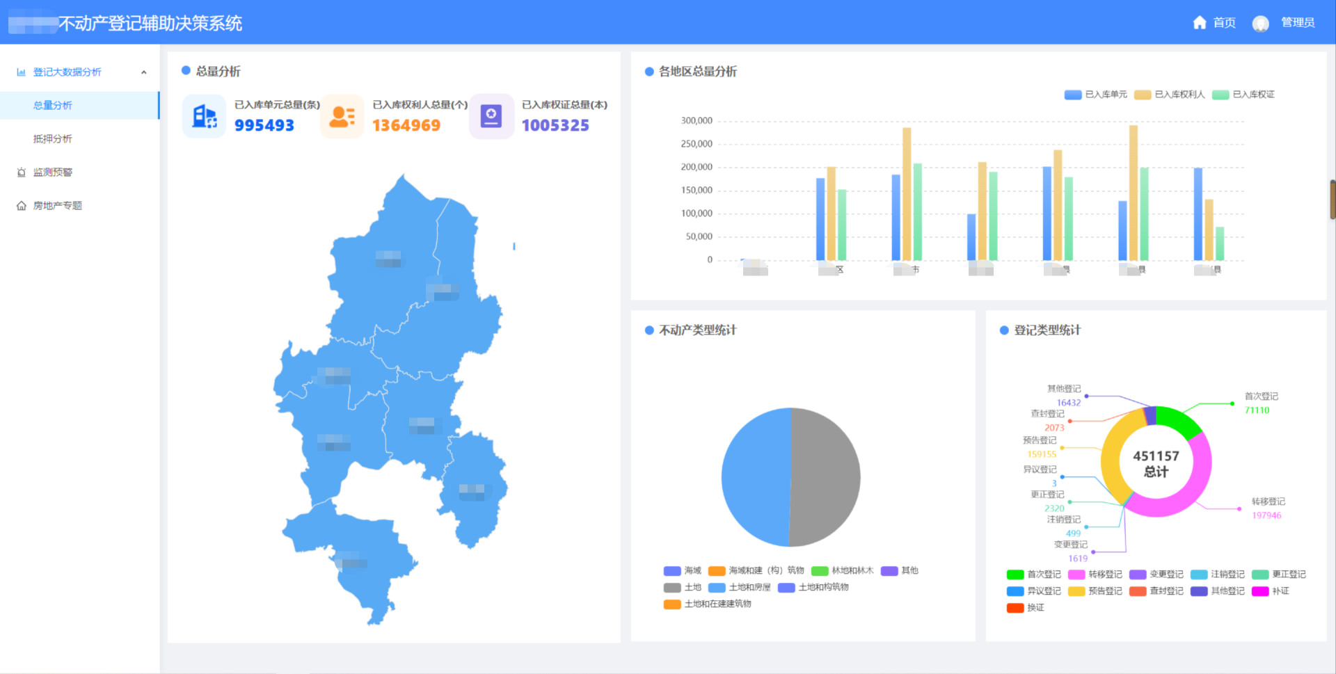 随着不动产登记改革的深入,不动产登记管理部门对登记信息整体监管和宏观决策的相关需求越来越明确,信息化要求也越来越高。结合管理和应用需求,利用云计算、大数据、人工智能、GIS等技术,通过深度挖掘数据价值,提取不动产登记知识服务,提供各类宏观决策分析服务。 |