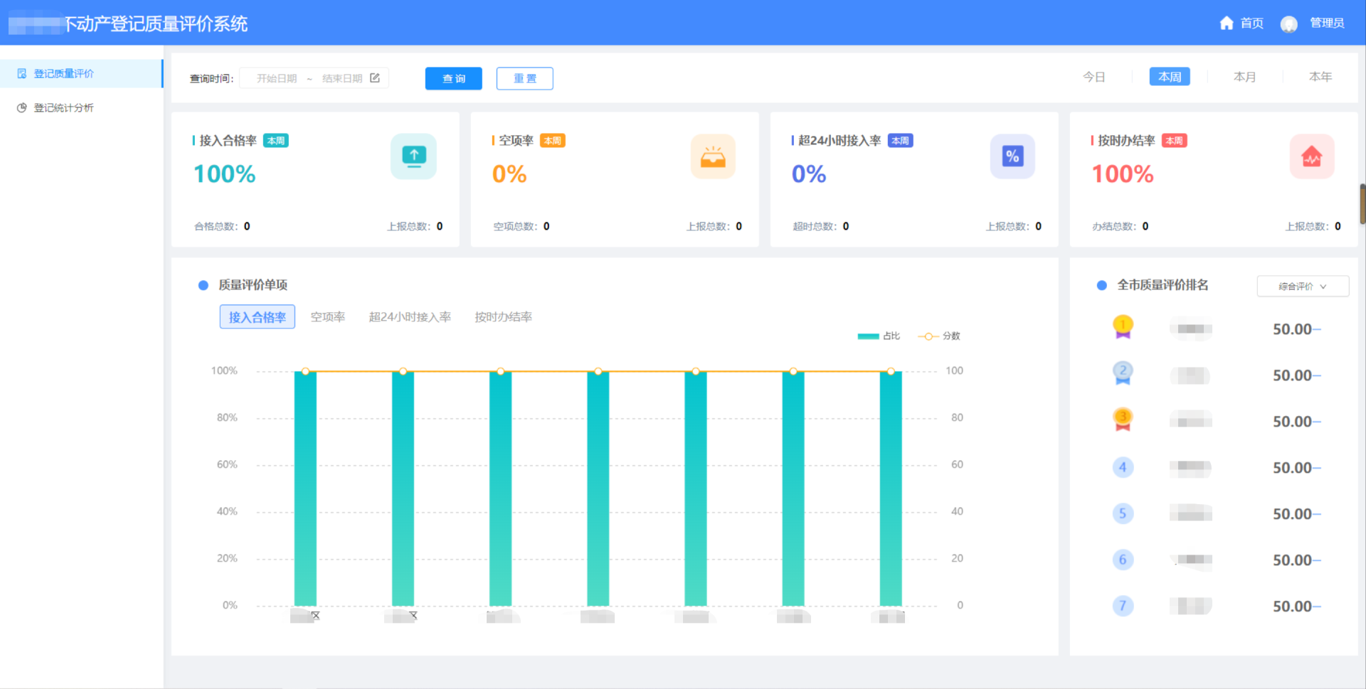 Ø 不动产登记质量评价分析子系统 不动产登记信息质量是不动产登记的核心,质量评价子系统从数据接入质量、登簿信息质量和业务办结率等多个方面对登记信息质量进行评价和打分。 |