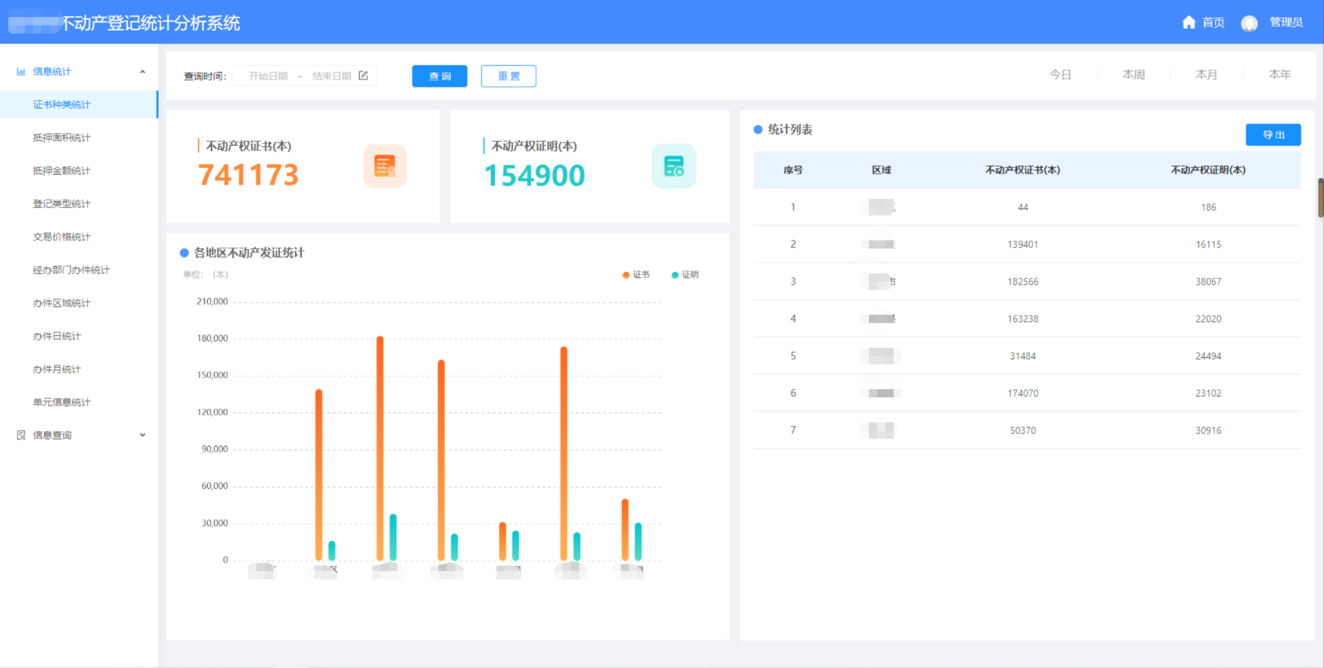 Ø 不动产登记统计分析子系统 运用大数据思维进行分析,实现海量数据的近实时汇总,按年、月、日生成各类基础报表,提供全市范围内不动产登记成果及监管数据的多维度查询和统计分析,统计分析结果均以直观报表或统计图形式展现,为全面监控不动产登记情况,提供可视化的决策依据。 |