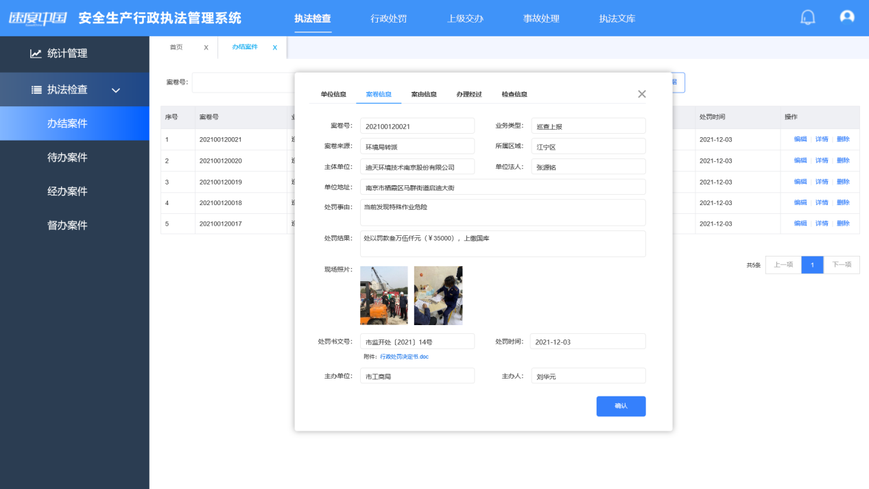 安全生产行政执法管理系统依据我国安全生产监督管理、行政执法管理工作和监察执法工作发展趋势及现状,运用大数据、云计算、物联网等先进技术,实现了一个高效、安全、实用的信息化安全生产行政执法管理系统。系统包括日常执法检查、行政处罚、举报投诉、违法案件登记、业务办理、审批审核、行政执法文书智能控制、管理查询等功能,实现执法工作全闭环。