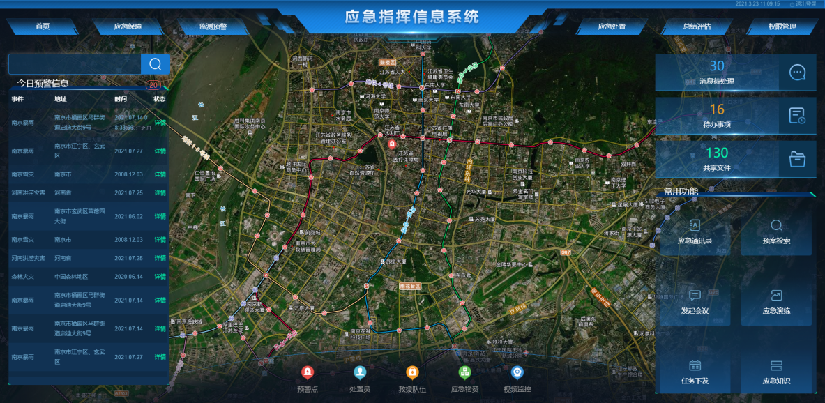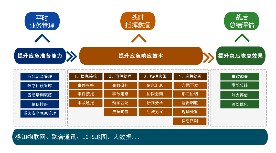 应急指挥决策系统以“一个中心、指挥协调、职能负责、快速反应、信息共享、应急联动”为建设目标,通过感知物联网、大数据、人工智能、融合通信、EGIS地图等多种技术手段,紧紧围绕平时业务管理、战中指挥救援、战后总结评估三个业务方向构建横向纵向立体联动的智慧化应急指挥体系,对语音、视频、数据进行高度融合。从而实现对各级各类突发公共事件应急管理的统一协调指挥,实现应急信息及时准确、应急资源协调共享、指挥决策统一高效。