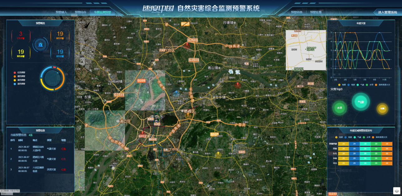 利用遥感技术和人工智能等技术实现多灾种全面预警监测,实现对多源数据的展示与分析、对重大的灾害及灾害链进行风险监测,并通过预警智能情景规则自组织等方法,形成区域内自然灾害综合监测预警信息,经过综合分析研判及多方协同会商,实现预警信息精准推送。