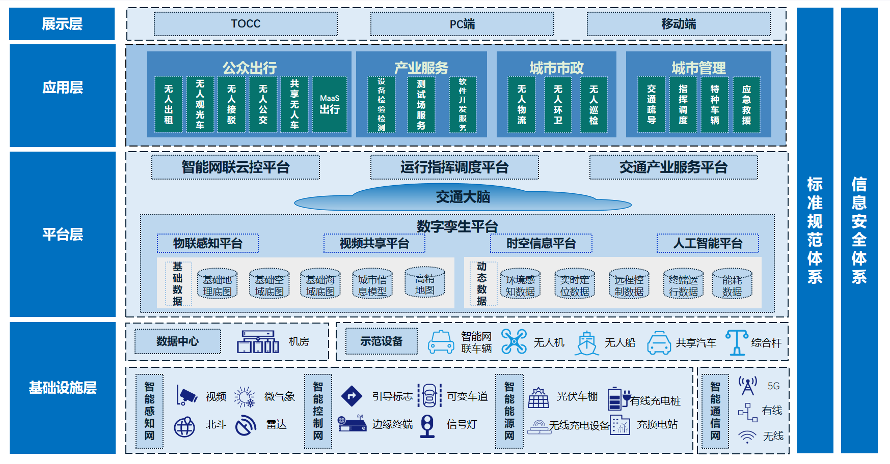 智慧交通产业集群服务围绕智慧交通、车路协同、高精度地图、高精度定位等方面,聚焦信息安全体系和行业标准规范体系,从基础设施层、平台层、应用层、展示层,4大层面,按照“1个交通大脑+4个服务平台+4张网+N个应用”的建设框架,构建系统集成、数据融合、车路协同的智慧交通新时代。