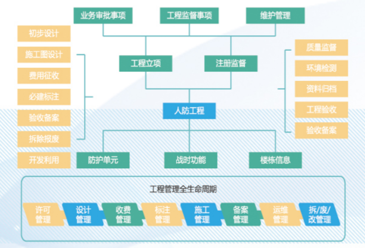 自建人防工程管理是以人防工程业务为核心、以透明化流程节点为抓手,对人防工程的规划、立项、许可、设计、收费、施工监督、标注、竣工、备案、运维、拆改报废等各环节进行统筹管理,实现服务、管理、监督一体化,为人防指挥通信提供决策支持。
