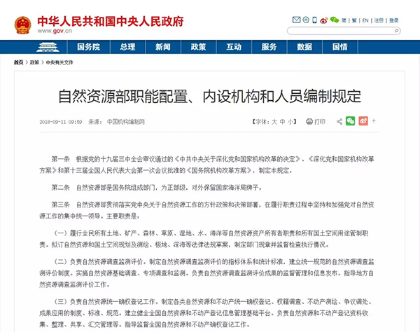 9月11日上午,国家政府网公布“自然资源部职能配置、内设机构和人员编制规定”。自然资源部“三定”方案正式出炉!