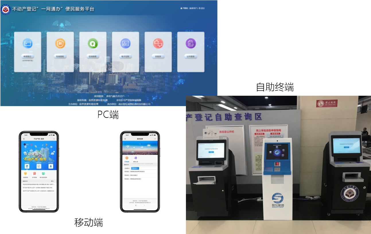 移动端覆盖微信公众号和App,自助终端包含自助证书机、自助证明机,证书证明一体机、自助申报机、进度查询机等多种终端设备,不动产办理和使用入口全覆盖。