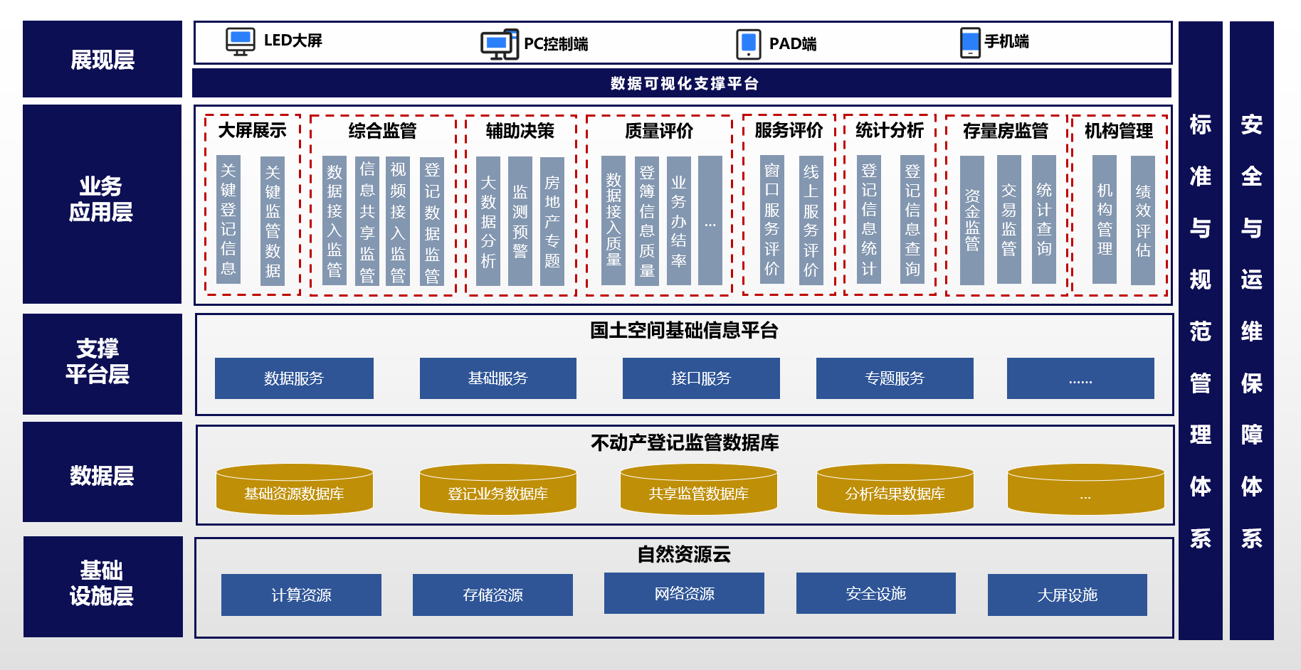 不动产交易登记信息监管平台,通过对不动产登记数据的管理,遵循国家标准建立多级分类编码体系的多粒度数据库,在海量不动产登记数据库中使用数据引擎对不动产登记信息动态、产权变动情况、交易情况和有关价格数据进行日常监管。平台以各级不动产登记数据库为基础,以信息网络为纽带,以标准、制度和安全体系为保障,以不动产登记的检查、上报、监管等模块为主线,形成了网格式的业务管理、决策支持和社会服务信息化体系。为不动产登记监管、经济宏观调控提供了强有力的监管数据支撑,为保护公民合法权利、完善不动产登记市场等提供了技术保障。